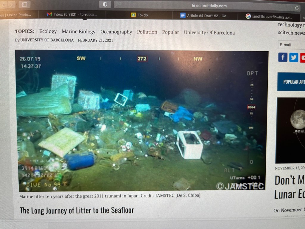 Here is a picture of the bottom of the ocean filled with recycle. Some statistics showing pollution proportions entering the ocean. Photo credit: Alexia Torres