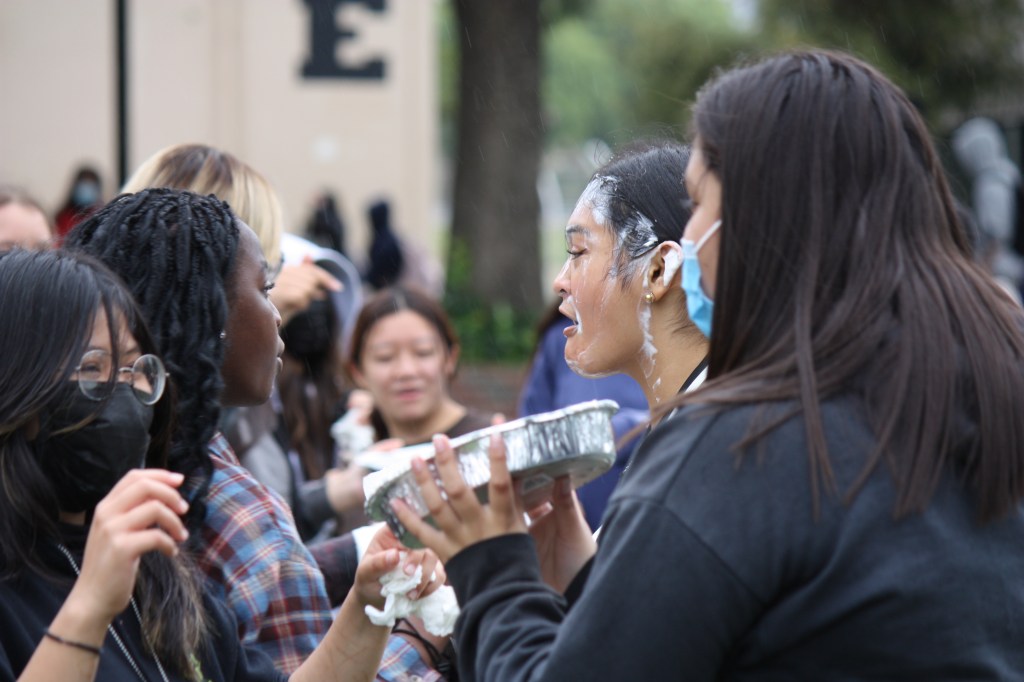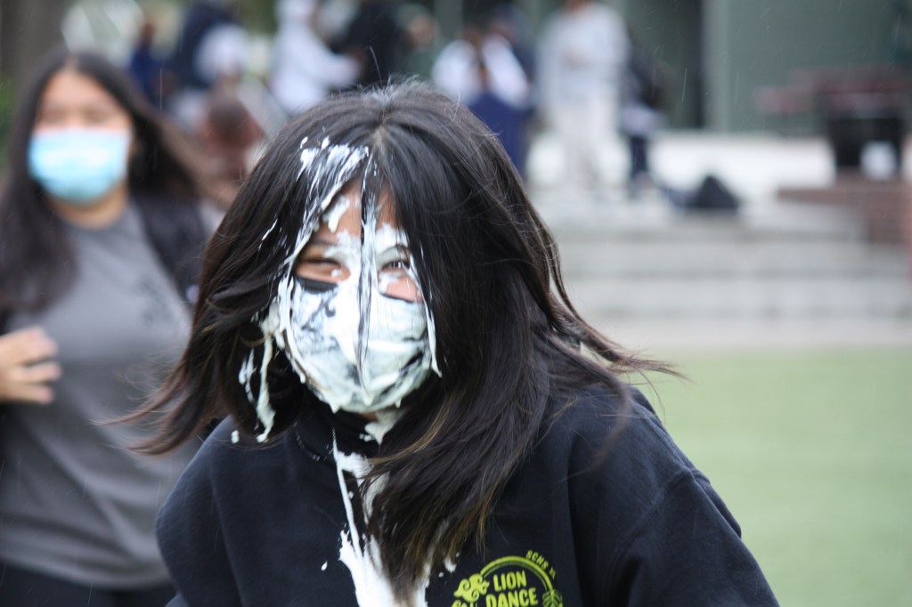 Students cleaning up the messy whip cream out of their faces