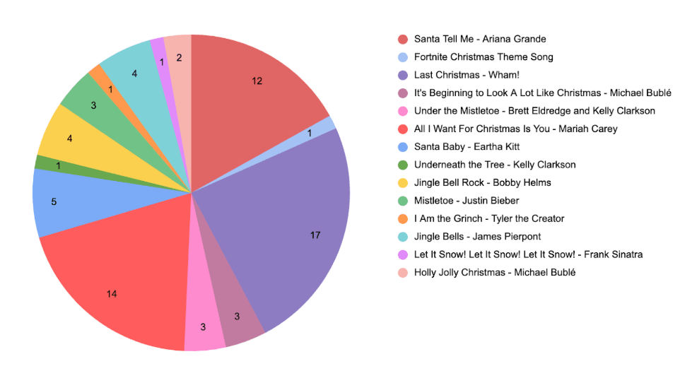 A poll was made for students to answer, asking what their favorite Christmas song was. There were 71 entries, the most popular songs being “Last Christmas!” by Wham!, with a whole 17 picks, “All I Want For Christmas Is You” by Mariah Carey with 14, and “Santa Tell Me” by Ariana Grande with 12.